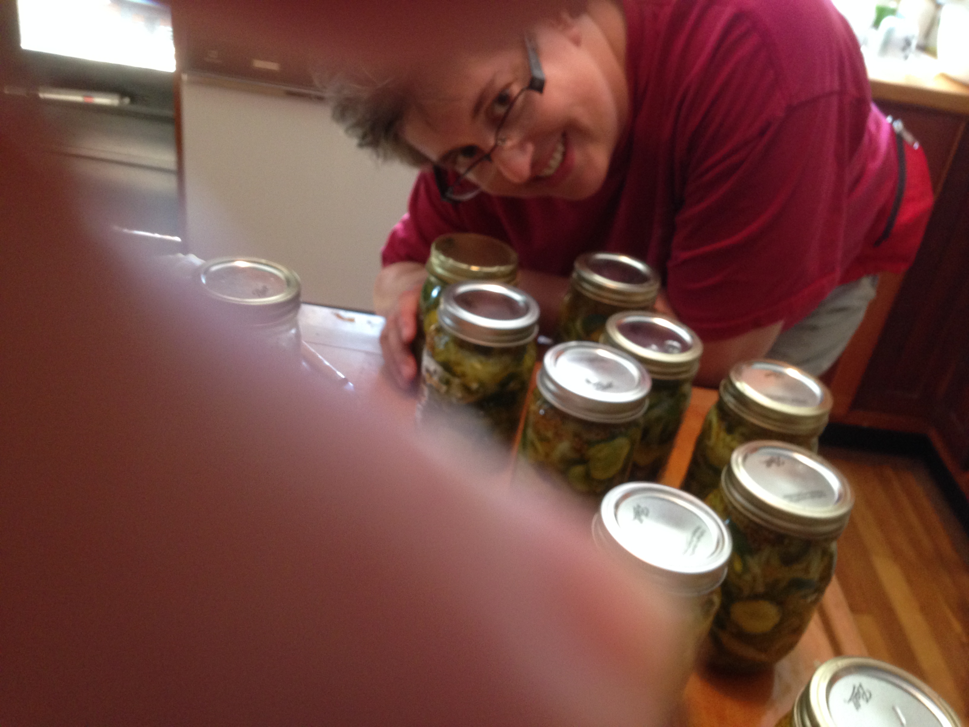 STEP THIRTEEN:  Carm displays the latest batch of her prized pickles.  She tried to take a picture of me, too.