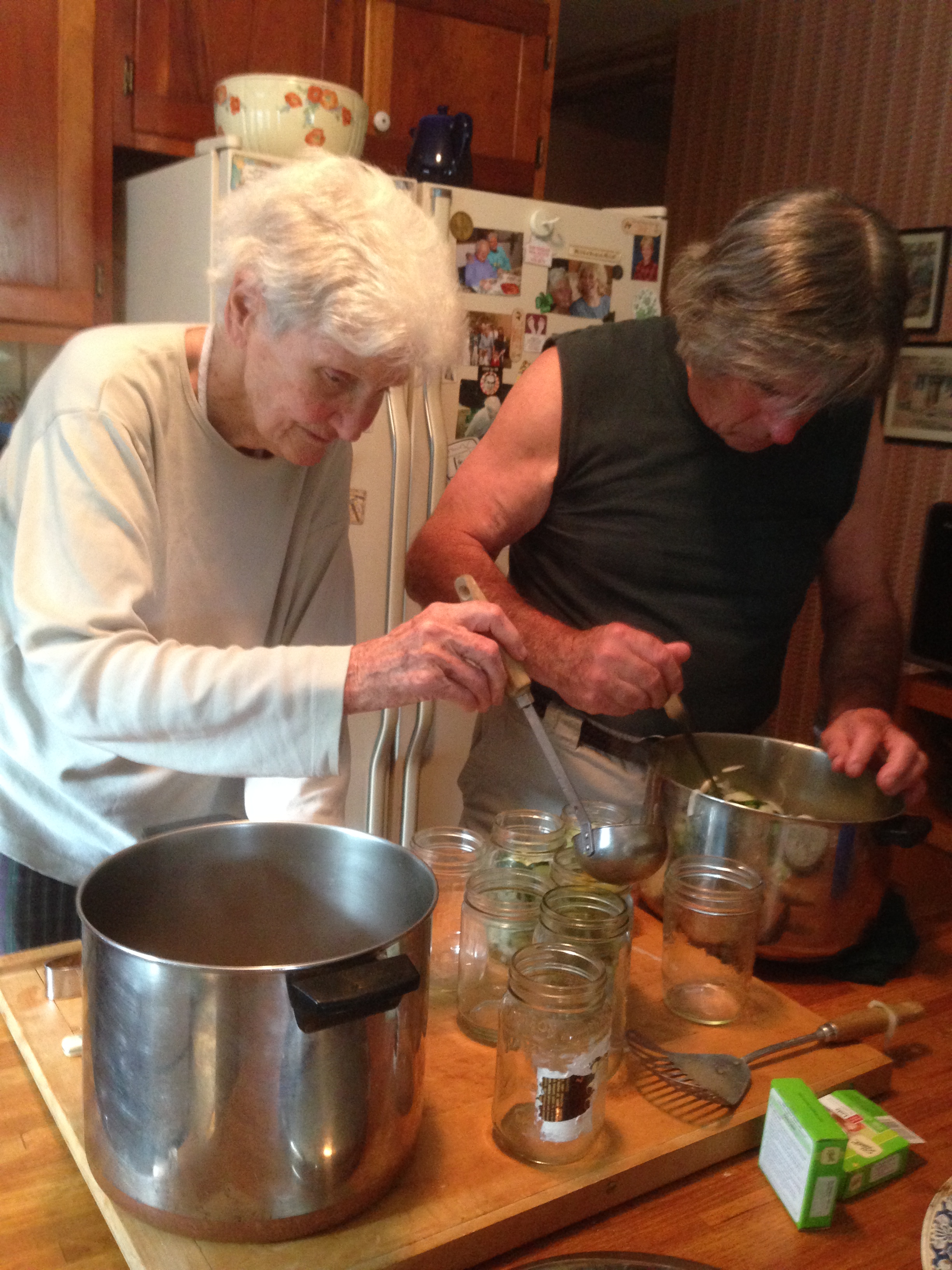 STEP FOURTEEN:  Well, there had to be a step fourteen, because thirteen would be unlucky!  Carm emailed me after our adventure to say that we were supposed to have brought the brine to a boil WITH the cucumbers.  Oops!  Carm says that at 84 she can’t be expected to remember every step perfectly.