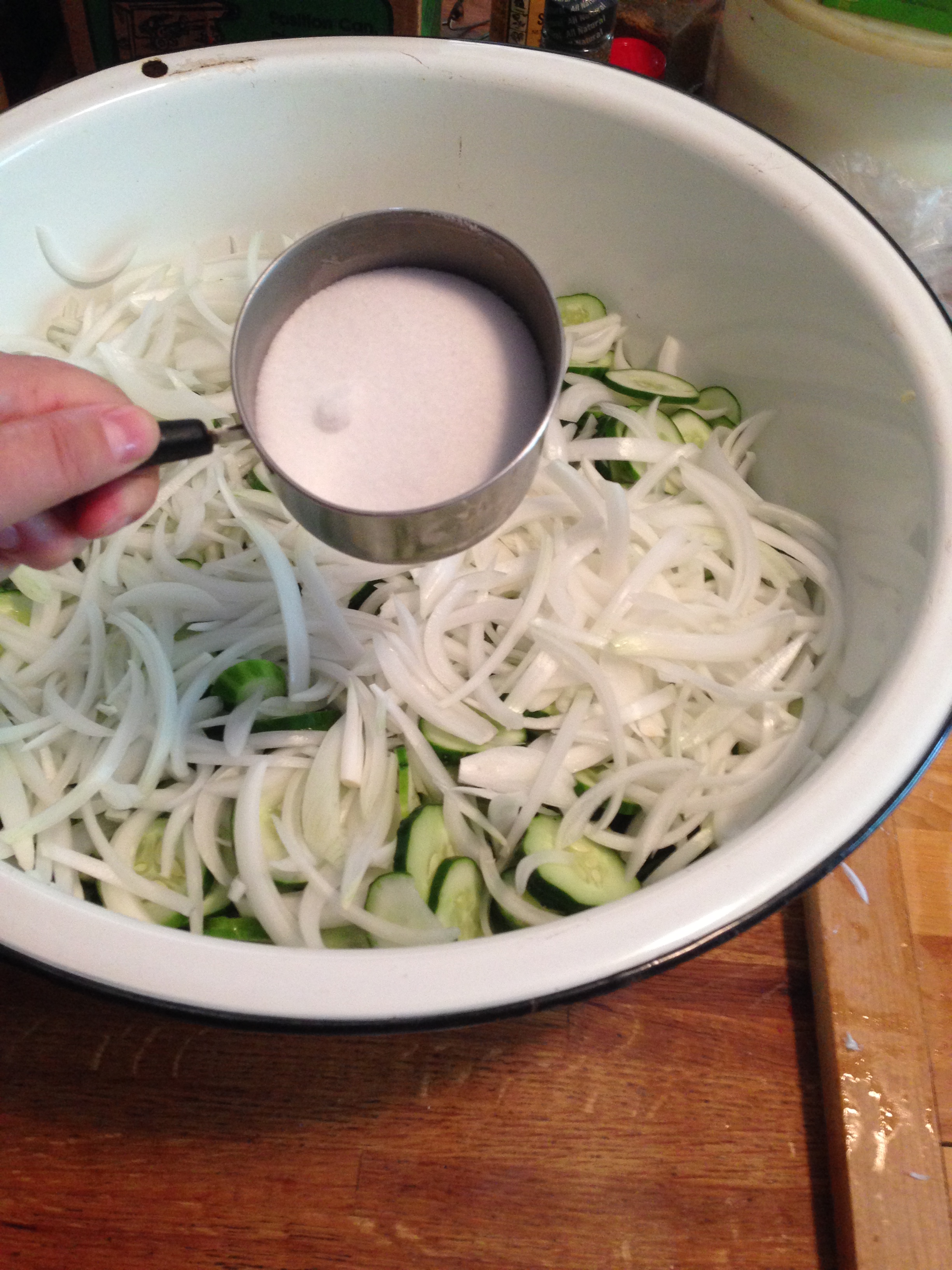 STEP FOUR:  Add salt and mix thoroughly.  The salt draws the water out of the cucumbers.