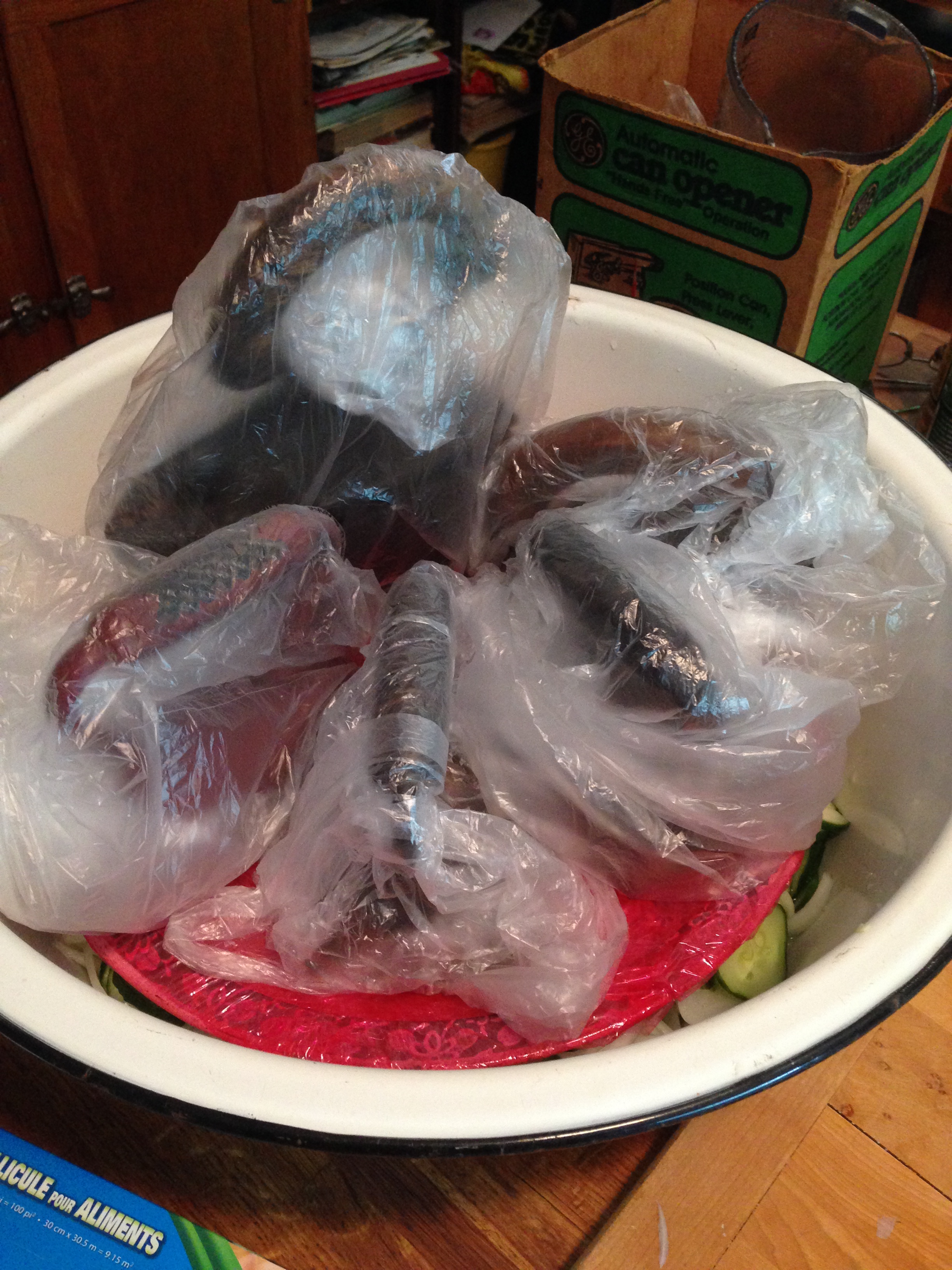 STEP FIVE:  To encourage the water to exit the cucumbers, we wrapped a tray in plastic wrap and placed it over the cucumber/onion/salt mixture.  We then loaded old-fashioned irons wrapped in plastic bags onto the tray to add about 7lbs of weight.  We stirred the mixture once an hour and removed the weight after three hours.  A LOT of water came out!