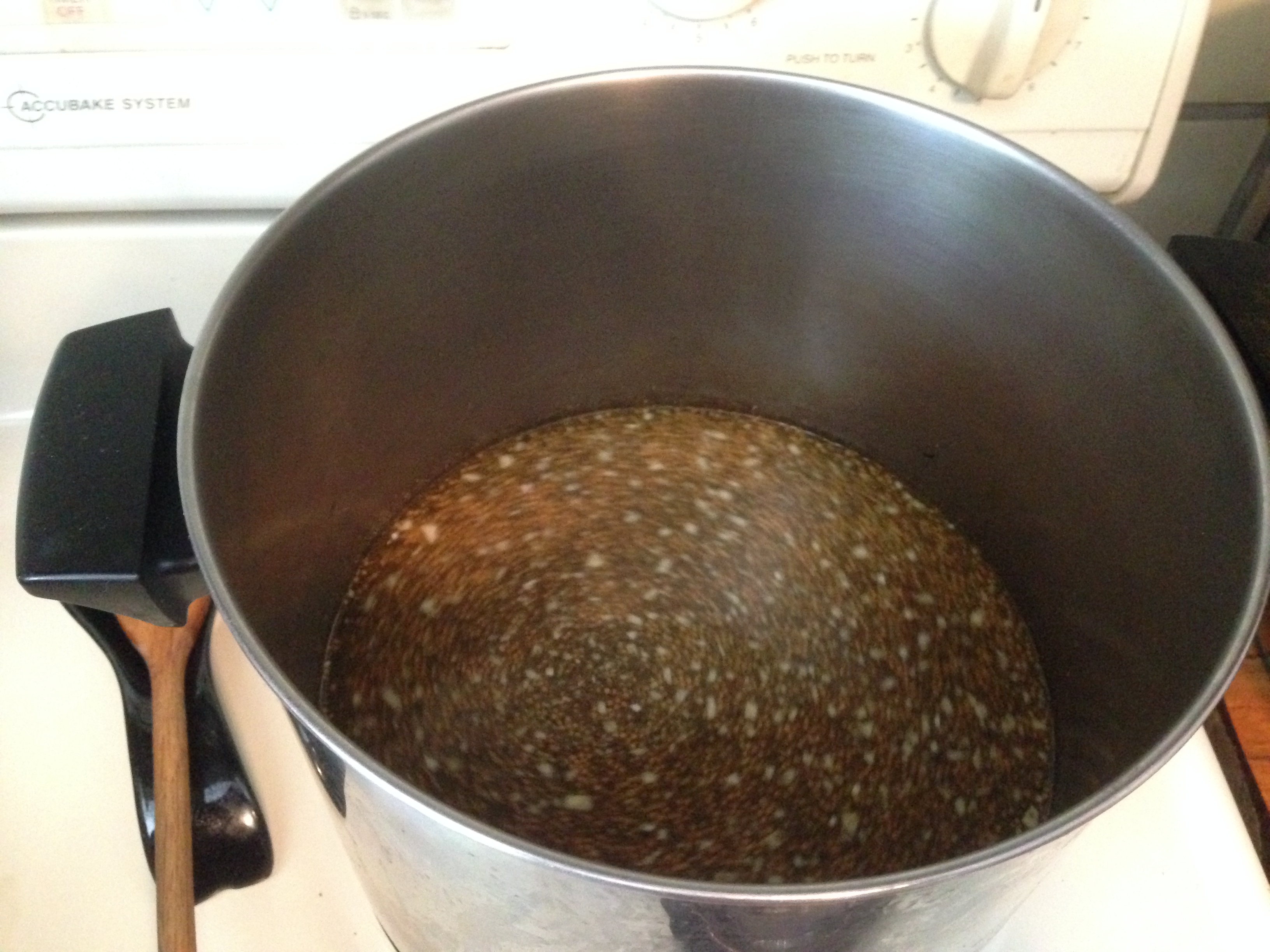 STEP SEVEN:  We mixed the brine with sugar, vinegar, tumeric, celery seed, cloves, all spice, garlic, and mustard seed.  Carm claims that the health food stores offer spices at more reasonable prices than the average grocery store.  We placed the mixture on the stove at a very low heat setting.  Carm says that it’s not good to boil brine.
